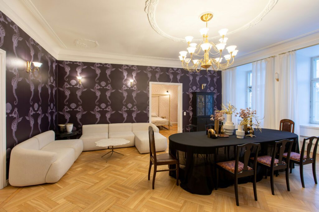 A maximalist space thrives on color. Experiment with vibrant hues, from deep jewel tones to bright pastels. “Play with inky color – bold, saturated hues are the hallmark of maximalist design or even mix some different styles like bohemian or midcentury,” recommends the Spacely AI team.