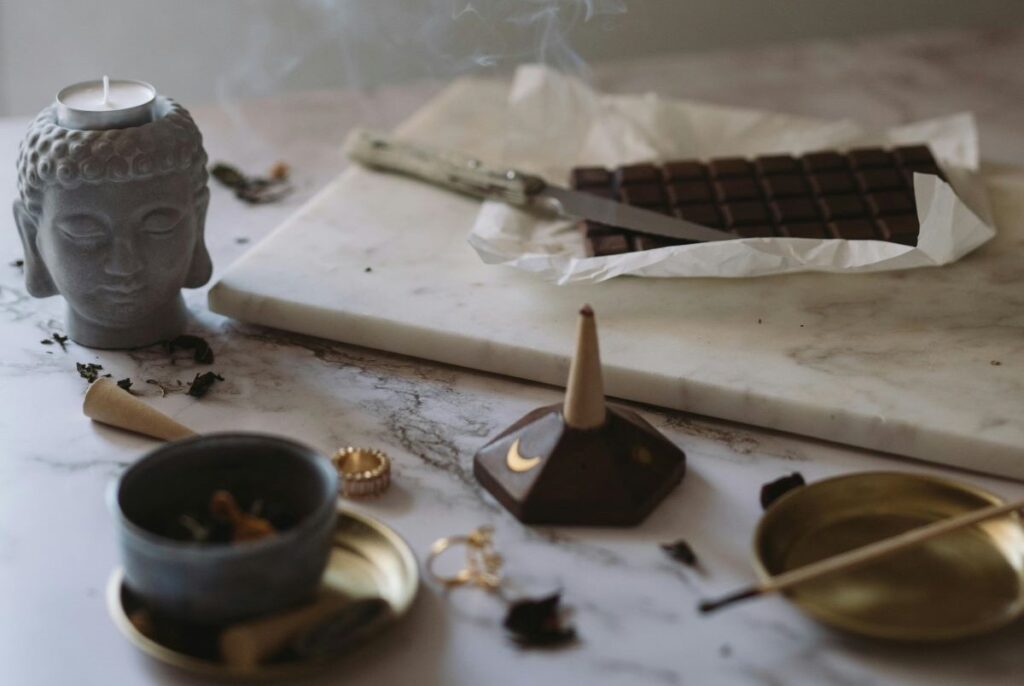 Creating a small altar or sacred space within your relaxation station can enhance the atmosphere of calm. Sarah Hentges from The Spiral Goddess Collective suggests creating “a small display space on a wall or small table — a place where you can rest your gaze for a moment or for sustained meditation. Collect small items that hold symbolic meaning. The rock you found on that hike, the figurine from your grandmother, the dried flowers from your garden.